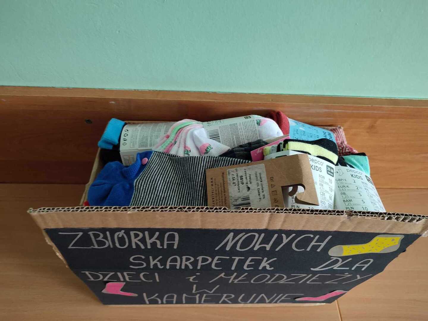 Zbiórka skarpet dla Kamerunu zakończona! Ogromnie się cieszymy, że nasza społeczność szkolna pozytywnie odpowiedziała na naszą akcję zbiórki skarpet dla dzieci z Kamerunu. Paczka została przesłana do Krakowa do Zgromadzenia Sióstr św. Dominika skąd wyruszy w dalszą drogę do dzieci z Kamerunu, dla których skarpetki, zakładane tylko na wyjątkowe okazje będą wielką niespodzianką i radością.