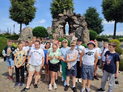 19 czerwca dzieci z klasy 3 i 4 wyruszyły na pielgrzymkę autokarową do Sanktuarium Najświętszego Sakramentu w Sokółce, by podziękować za dar I Komunii Świętej. W Sanktuarium wzięliśmy udział we Mszy świętej, po czym poznaliśmy historię tego miejsca oraz oddaliśmy cześć Panu Jezusowi w cudzie eucharystycznym. Kolejnym etapem naszej podróży była Święta Woda. Tu odwiedziliśmy Górę Krzyży i oddaliśmy się zabawie w Kaplicy Radości. Na koniec naszej wyprawy odwiedziliśmy Park Dinozaurów w Jurowcach.