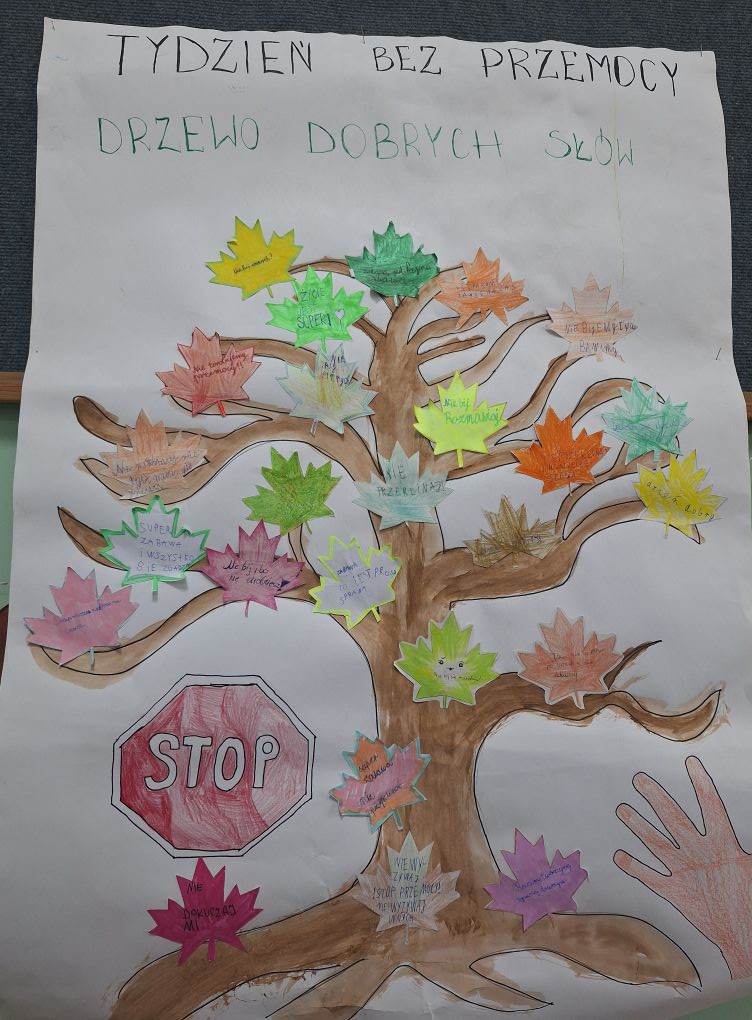 W ramach tygodnia przeciw przemocy rówieśniczej w czasie zajęć świetlicowych uczniowie pokazali jak mogą okazywać sobie życzliwość i empatię na co dzień. Nie szczędzili sobie komplementów. Stworzyli też drzewo dobrych słów. Praca sprawiła im mnóstwo radości.