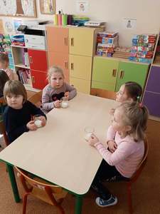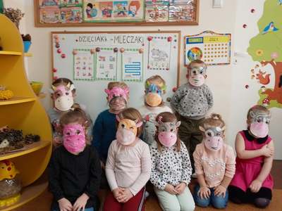 W dniach 22-24.02.2021r. w punkcie przedszkolnym realizowany był ogólnopolski projekt edukacyjno-informacyjny dla dzieci w wieku przedszkolnym oraz ich rodziców „Dzieciaki Mleczaki”, organizowany przez Polską Izbę Mleka, a sfinansowany ze środków Funduszu Promocji Mleka. Celem projektu było przekazywanie wiedzy dzieciom na temat jakości produktów mlecznych i ich walorów zdrowotnych oraz znaczenia ich w diecie dzieci, wykorzystując formę nauki poprzez zabawę. Akcja miała również na celu wypracowanie prawidłowych nawyków żywieniowych, kreowanie mody na picie mleka oraz zwiększenie świadomości rodziców na temat roli mleka i produktów mlecznych w diecie dziecka w wieku przedszkolnym. Podczas realizacji projektu dzieci uczestniczyły w zabawach ruchowych, wykonywały różne karty pracy z ramach realizacji scenariusza zajęć dla dzieci 3-4 letnich: „Mleczne opowieści”. Przedszkolaki wspólnie degustowały też mleko oraz przyniesione przez siebie jogurty, serki, przez co poznały smak różnych produktów mlecznych. Z kolei panie kucharki dbały o urozmaicone, bogate w produkty mleczne posiłki dla dzieci. Na zakończenie projektu samodzielnie wykonały maskę krowy i wykonały pamiątkową fotografię.