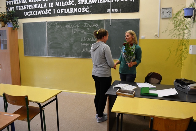 W dniu 16.10. 2014 roku gościła w gimnazjum pani Izabela Sobczak, osoba, która prowadzi własną jednoosobową działalność gospodarczą w naszym regionie. Uczniowie klasy III, w ramach planowania przyszłej ścieżki edukacyjno-zawodowej, mieli okazję dowiedzieć się , jakie kroki należy podjąć, aby założyć własną firmę. Pani Iza w ciekawy sposób zachęcała młodzież do podejmowania odważnych, planowych i samodzielnych działań w życiu oraz wytrwałości w realizacji celów. Uczniowie dowiedzieli się czym jest biznesplan,co to jest NIP i REGON, uczyli się wypełniać wniosek –zgłoszenie zamiaru założenia firmy , który składa się w Urzędzie gminy lub miasta.