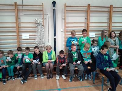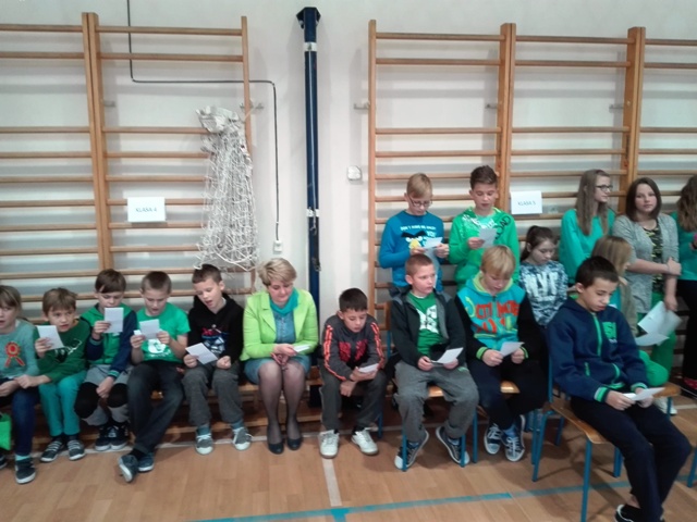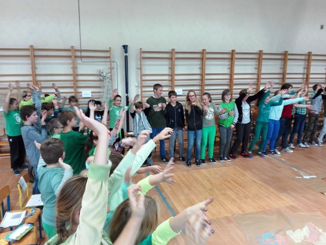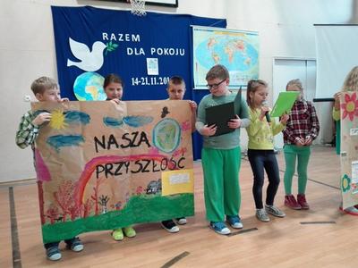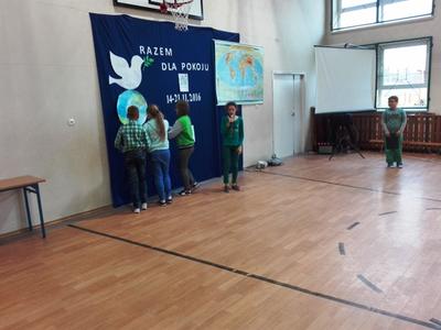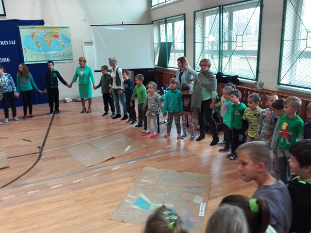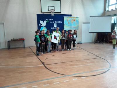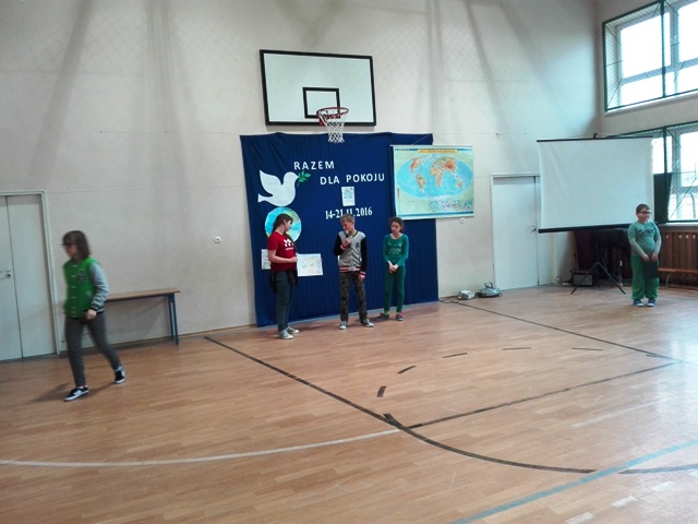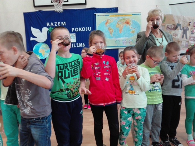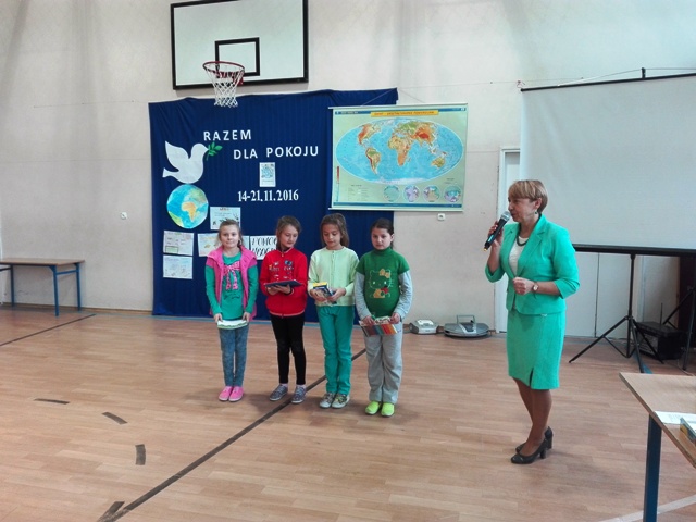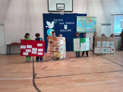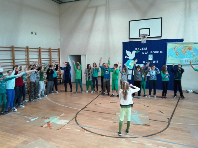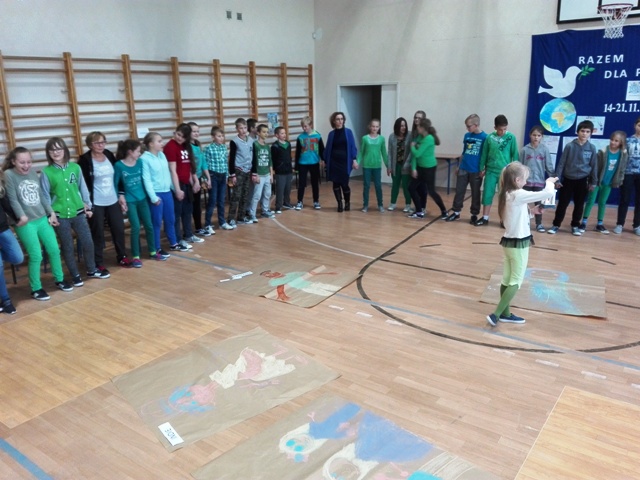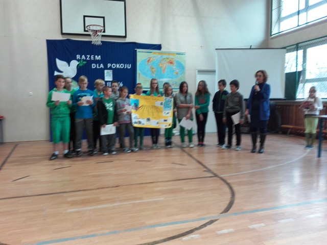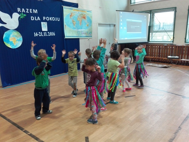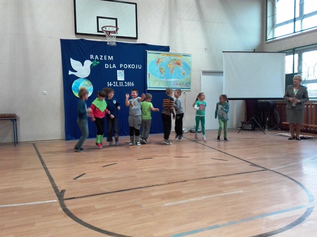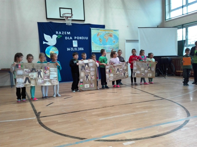 18 listopada 2016 roku w Szkole Podstawowej im. Marii Konopnickiej w Sokółkach odbyło się spotkanie wszystkich uczniów i nauczycieli w celu podsumowania wiedzy i dokonań podczas Tygodnia Edukacji Globalnej. Rozpoczęliśmy od obejrzenia prezentacji przedstawiającej dzieci z całego świata, słuchaliśmy piosenki Majki Jeżowskiej ,, Wszystkie dzieci nasze są", która wprowadziła nas w nastrój tego dnia. Ubrani byliśmy na zielono co miało symbolizoać nadzieję na pokój na całym świecie. Na głównej tablicy widniał napis ,,Razem Dla Pokoju". Uczniowie klasy III przedstawili nam najważniejsze treści edukacji globalnej. Następnie obejrzeliśmy taniec afrykański w wykonaniu przedszkolaków. Klasa I zaprezentowała plakaty wykonane własnoręcznie oraz obrazki kolorowane barwami afrykańskimi, nie zabrakło również tańca z tego kontynentu. Uczniowie klasy II opowiadali o Afganistanie oraz częstowali nas herbatą pochadzącą z tego kraju. Trzecioklasiści przybliżyli nam tematykę ekologii oraz cele zrównoważonego rozwoju prezentując wykonane plakaty. Starsi uczniowie opowiadali o Bangladeszu. Piąta klasa zaprezentowała potrzeby globalnego południa, a szósta sposoby udzielanej pomocy. Kolejnym punktem programu była zabawa związana z układaniem słowa ,,pokój" napisanego w różnych językach. Klasy losowały napisy, a nastepnie ,,układały się" tworząc to słowo. W dalszej kolejności malowaliśmy dzieci całego świata na dużych arkuszach papieru kolorową kredą. Namalowane dzieci z całego świata utworzyły z nami krąg pokoju. Wewnątrz zapaliliśmy światełko pokoju i trzymając się za ręce śpiewaliśmy słowa ,,We are the world, we are the children, We are the ones who make a brighter day".