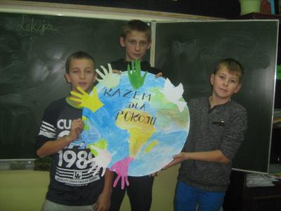 Uczniowie klasy VI, pod kierunkiem Hanny Turowicz, na lekcji plastyki, , wykonali plakat na temat „RAZEM DLA POKOJU”.