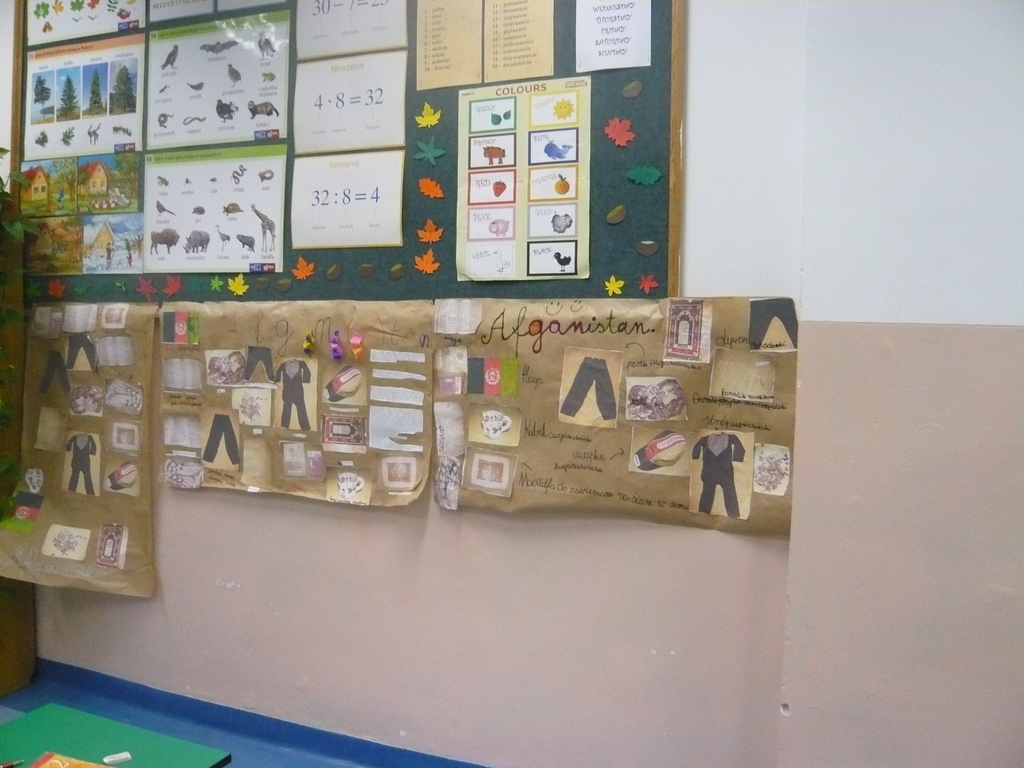 W dniach 14- 15.11.2016 roku zostały przeprowadzone zajęcia w klasie II z edukacji globalnej. Pierwszego dnia uczniowie podczas zabawy dydaktycznej „Skąd pochodzisz dokąd lecisz? utrwalili podstawowe wiadomości o Polsce i odczytali hasło „Afganistan”. W ten sposób uczniowie dowiedzieli się o jakim państwie będą zdobywać wiedzę. Pokazali na mapie, gdzie leży Polska, a następnie Afganistan. Uczniowie patrząc na mapę świata przeanalizowali jaka jest odległość między tymi krajami i w jaki sposób można najszybciej pokonać tę podróż. Przy śpiewie piosenki „Podróż na dywanie utkanym w Afganistanie", przenieśli się w zabawie do Afganistanu. Poznali symbole narodowe oglądając ilustracje. Następnie rozmawiali o życiu codziennym dzieci z Afganistanu. Potem wykonali plakaty przedstawiające przedmioty związane z tym państwem. Na zajęciach technicznych uczniowie samodzielnie zrobili herbatkę z kardamonem, sokiem cytrynowym i pomarańczowym jaką piją afgańskie dzieci. Na koniec zajęć uczniowie podsumowali jaką wiedzę zdobyli. Zakończyli je śpiewając piosenkę „Podróż na dywanie utkanym w Afganistanie".