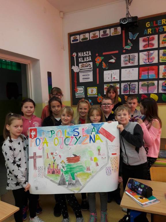 Dzisiejsza lekcja plastyki w klasie 4 była poświęcona naszej ojczyźnie. Przypomnieliśmy trudne lata zaborów i wojen oraz bohaterstwo i walki Polaków o wolność, którą dziś się cieszymy. Na pytanie „Z czym ci się kojarzy Polska-twoja ojczyzna? - można było usłyszeć : to flaga biało-czerwona, to godło, to góry Tatry, to bociany, które przylatują na wiosnę, to krzyż, to Morze Bałtyckie, to nasz hymn. Następnie każdy uczeń namalował wymienione przez siebie skojarzenia. Na koniec dzieci przykleiły swoje obrazki na wspólny arkusz, tworząc pracę zbiorową-obraz przedstawiający nasz wspólny Dom-Polskę.