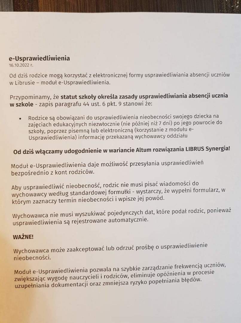 Warto zapoznać się z nowymi możliwościami usprawiedliwienia nieobecności w szkole. Informacje umieszczone są w pliku .jpg
