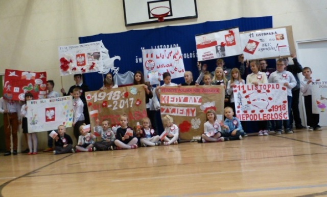 Każda klasa, wcześniej, na lekcjach z wychowawcą, na zajęciach techniki i plastyki wykonała plakaty związane ze Świętem 11 listopada, a także biało-czerwone kotyliony i chorągiewki., które zaprezentowano na apelu niepodległościowym.